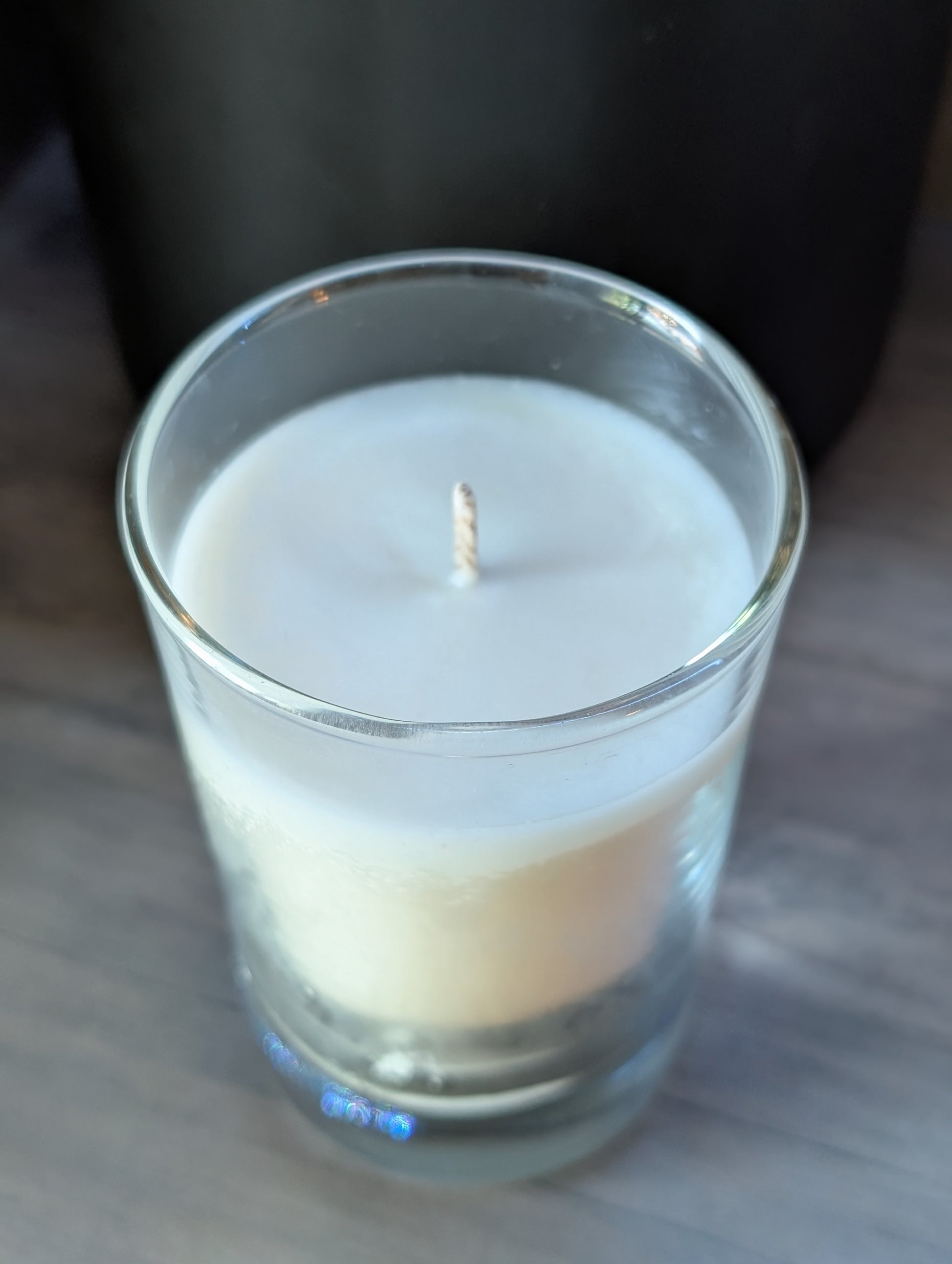 Small 6 oz soy candle. Made in double shot glass. These glasses were donated from a bar that otherwise would have thrown them in the trash.