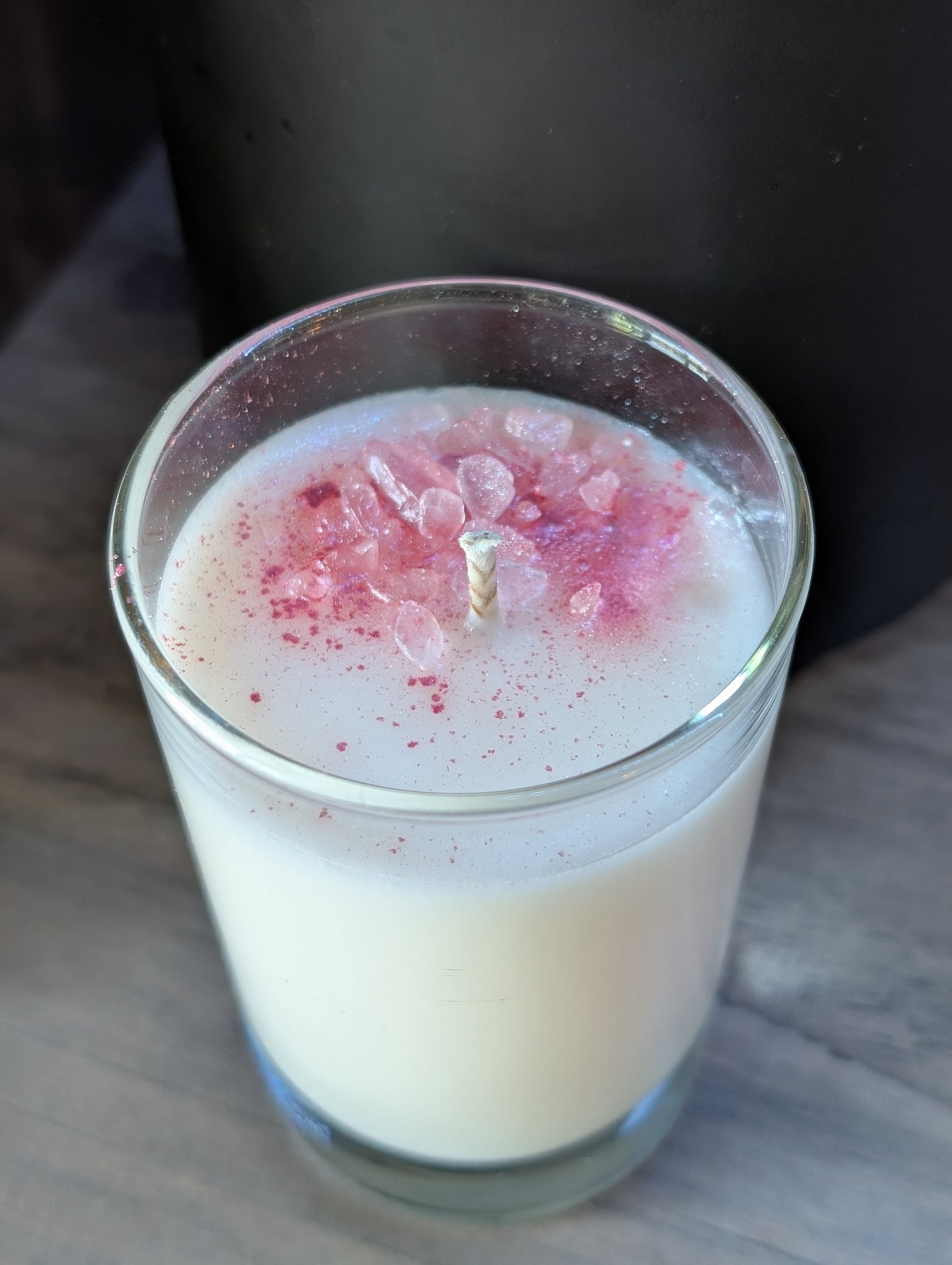 Small 6 oz. Soy candle made in a double shot glass. This candle is decorated with Mica powder and rose quartz stones. These glasses were donated from a bar that otherwise would have thrown them in the trash.