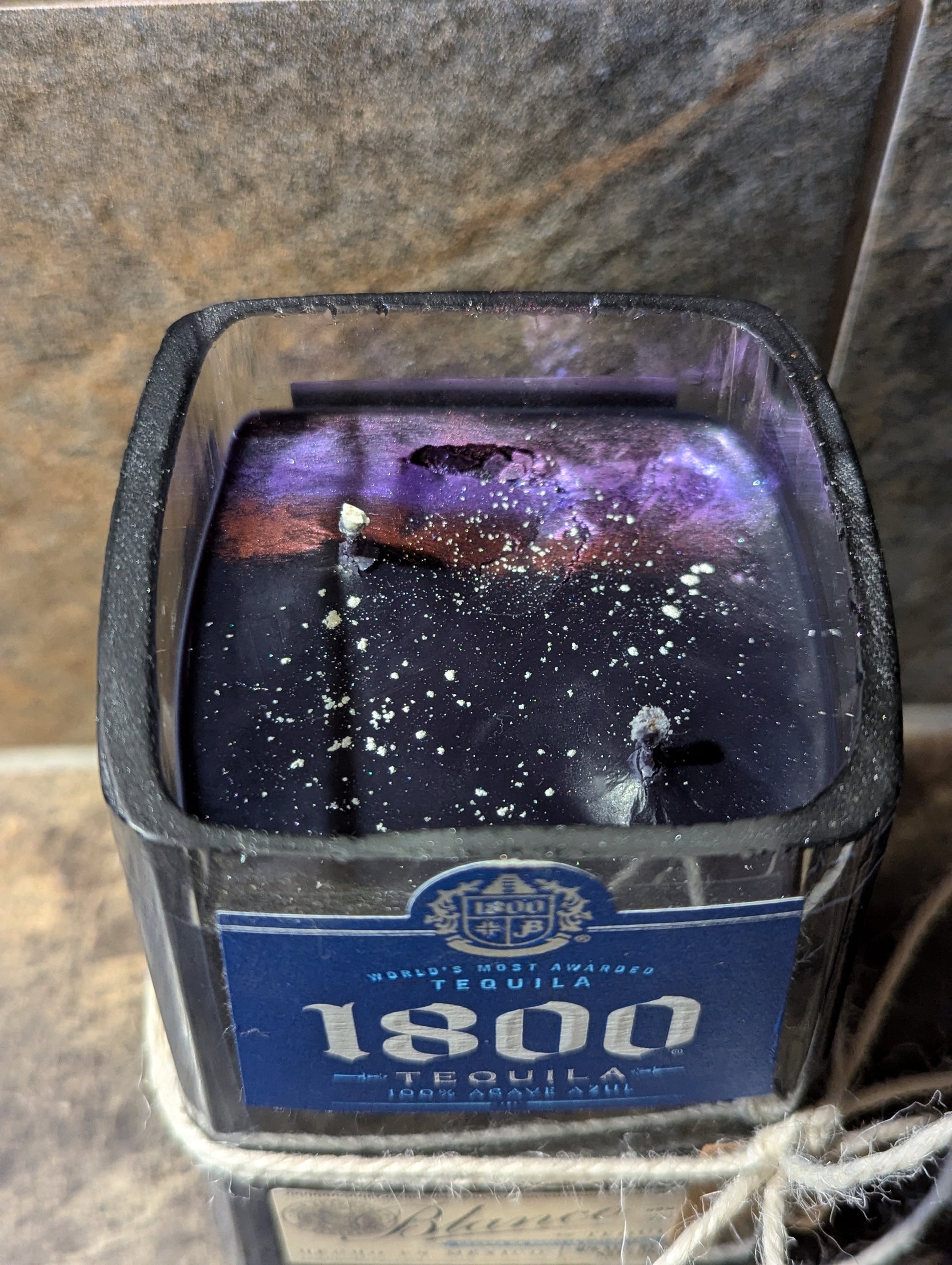 100% Organic Soy Wax Candle. Jet Black coloring is provided by black wax chips, dusted with mica powder giving a space like appearance. 30 oz candle. She's a big one.