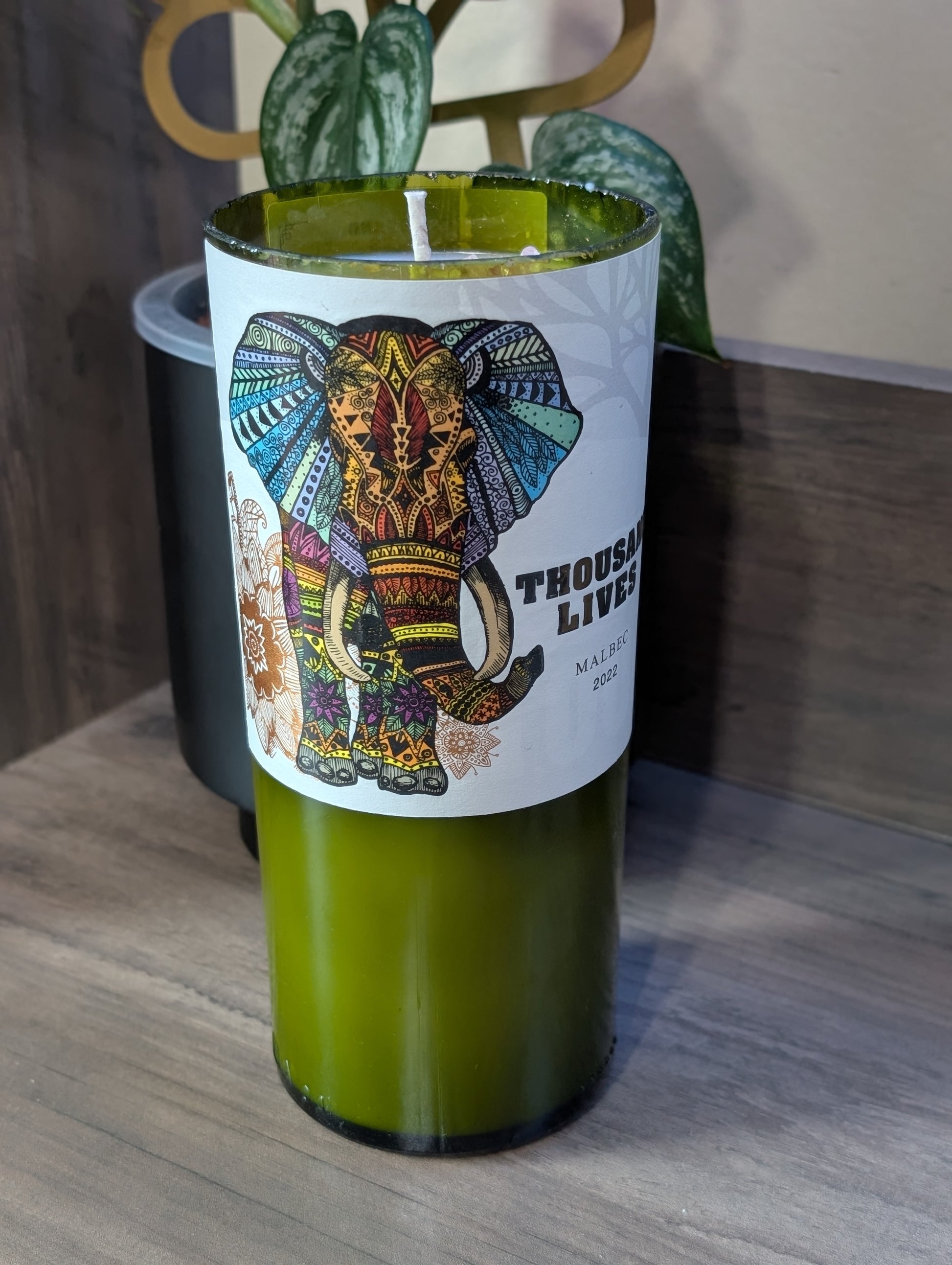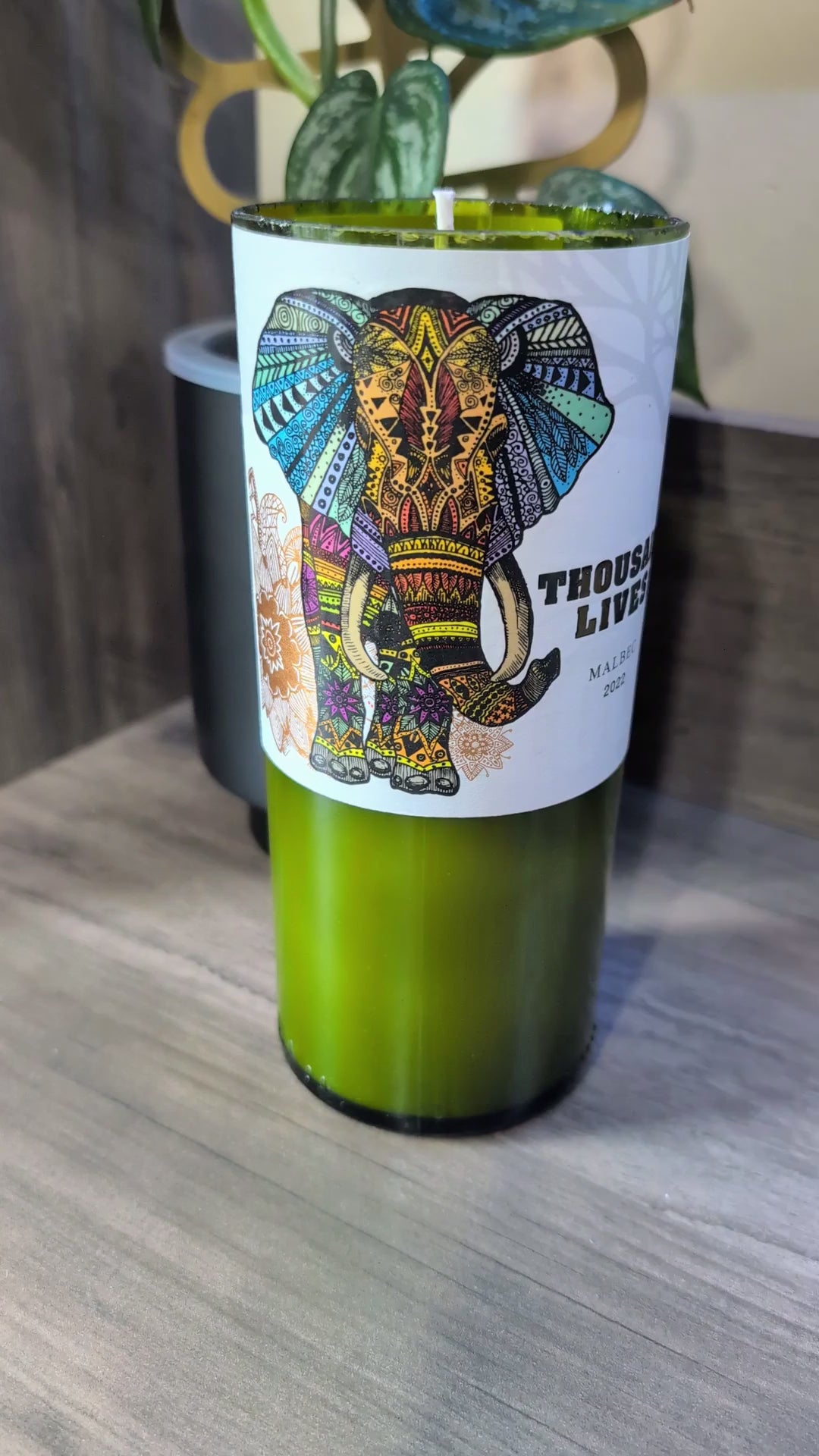 Uniquely designed 20 oz wine bottle candle. Decorated with Mica powder and rose quartz stones.